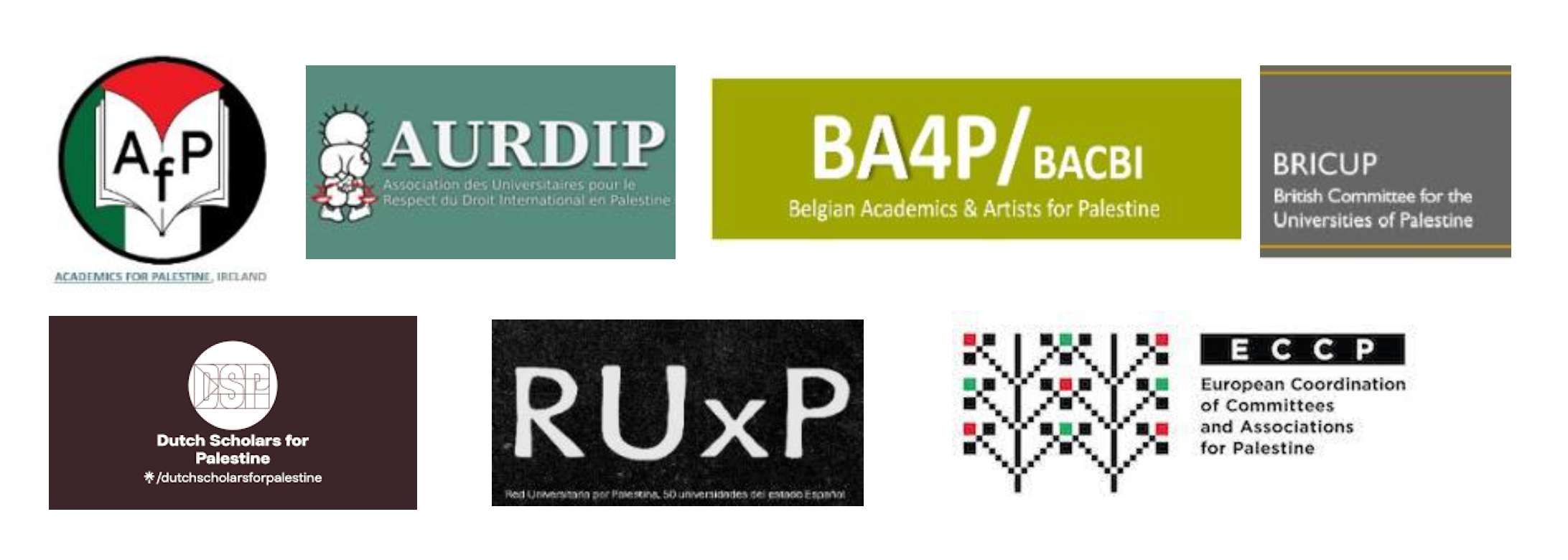 For more information, please contact: ECCP (Europe): eccp.brussels@gmail.com, AFP (Ireland) academicsforpalestine@gmail.com; AURDIP (France) contact@aurdip.fr; BA4P (Belgium) info@bacbi.be; BRICUP (UK) j.rosenhead@lse.ac.uk; Dutch Scholars for Palestine (Netherlands) dutchscholarspalestine@gmail.com; RUXP (Spain) lera@us.es