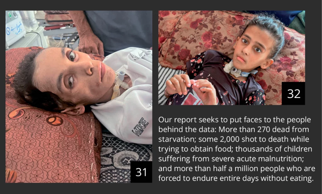 Our investigative report seeks to put faces to the people behind the data, as of today: more than 270 dead from starvation; some 2,000 people shot to death while trying to obtain food; thousands of children under the age of 5 suffering from severe acute malnutrition; tens of thousands of children in the same age group suffering from acute malnutrition; and more than half a million people who are forced to endure entire days without eating.