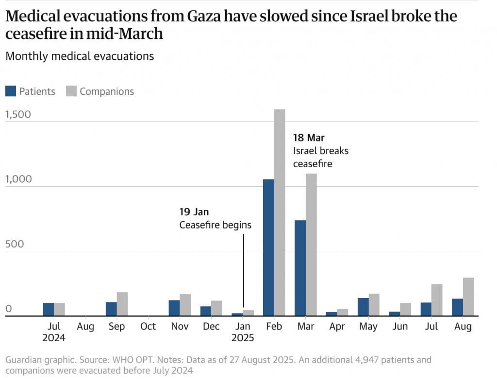 So far over 700 patients – many of them children – have died waiting for permission to be granted to leave Gaza by Cogat, the Israeli government department responsible for approving medical evacuations, according to the WHO.