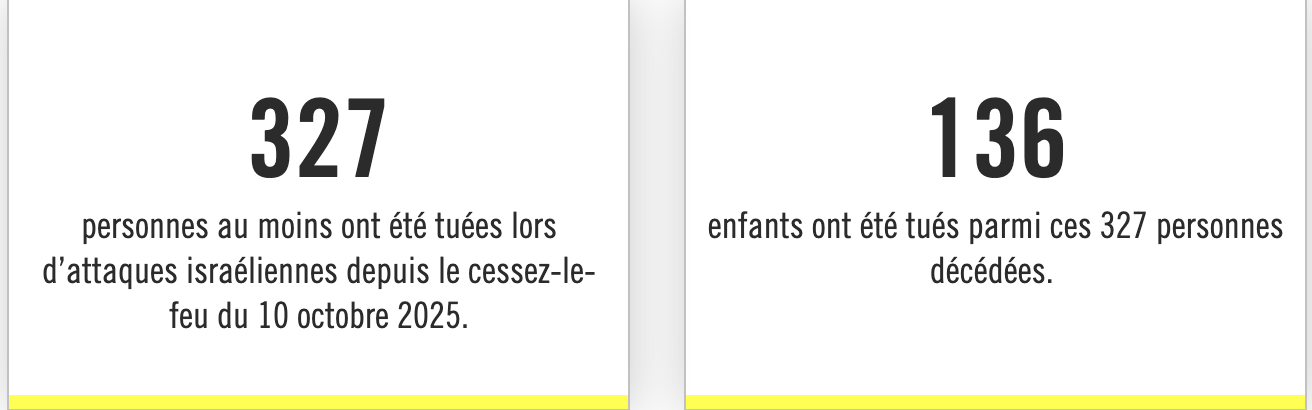 Mais un mois après les premiers soulagements suscités par cet accord fragile, les espoirs de paix et de fin des souffrances du peuple palestinien s’évanouissent. Dans un rapport publié le 27 novembre 2025, les équipes d’Amnesty International constatent que le génocide continue. Israël maintient les conditions de vie qui condamnent les Palestinien·nes à mourir à petit feu.