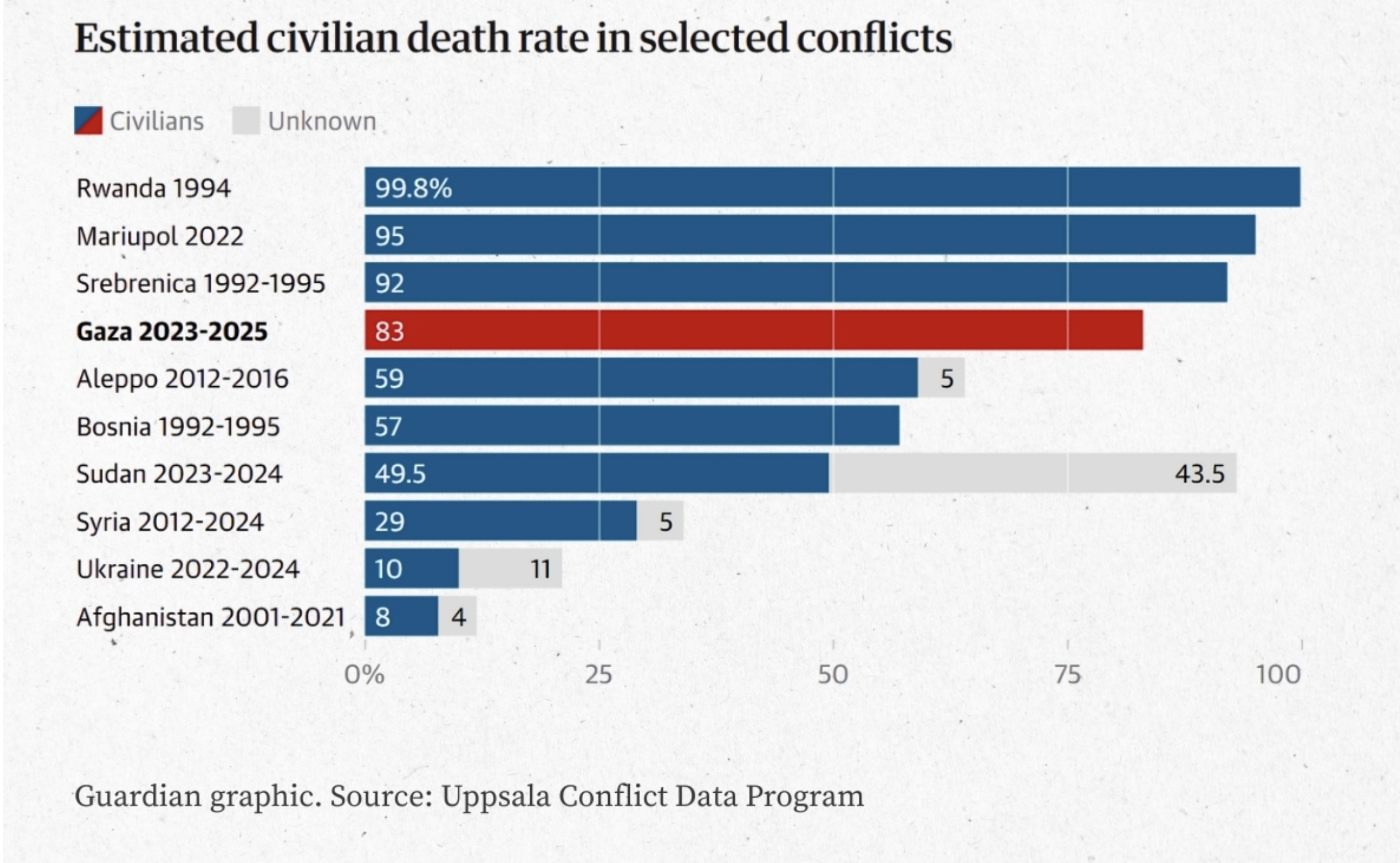Si l’on suppose que la totalité des morts certaines et probables de combattants ont été comptées dans le nombre de morts, cela signifierait que plus de 83 % des morts de Gaza étaient des civils. Si les morts probables sont décomptées et si l’on n’inclut que les morts certaines, la proportion de morts civiles s’élève à plus de 86 %.